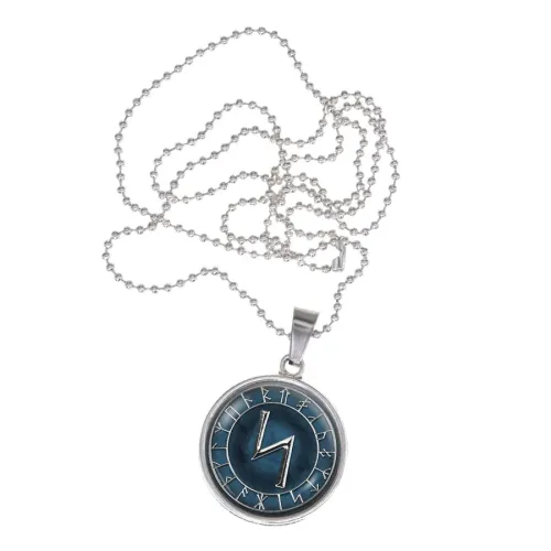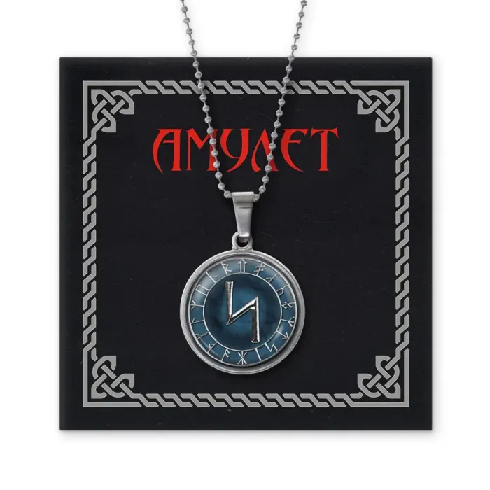 Славянский амулет — кулон из бижутерного сплава с покрытием под серебро и защищённым стеклянной линзой изображением.