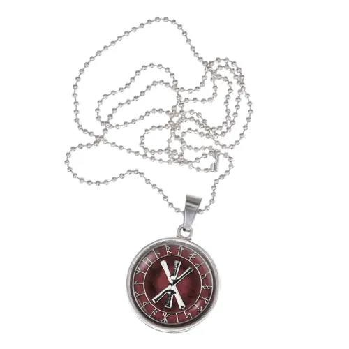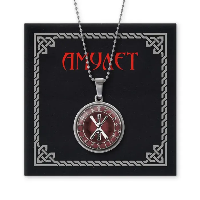 Славянский амулет Рок — кулон из бижутерного сплава с покрытием под серебро. Изображение руны расположено под выпуклой стеклянной линзой.