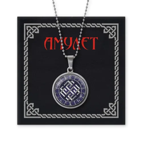 Славянский амулет Родимыч — кулон из бижутерного сплава с покрытием под серебро. Изображение расположено под выпуклой стеклянной линзой.