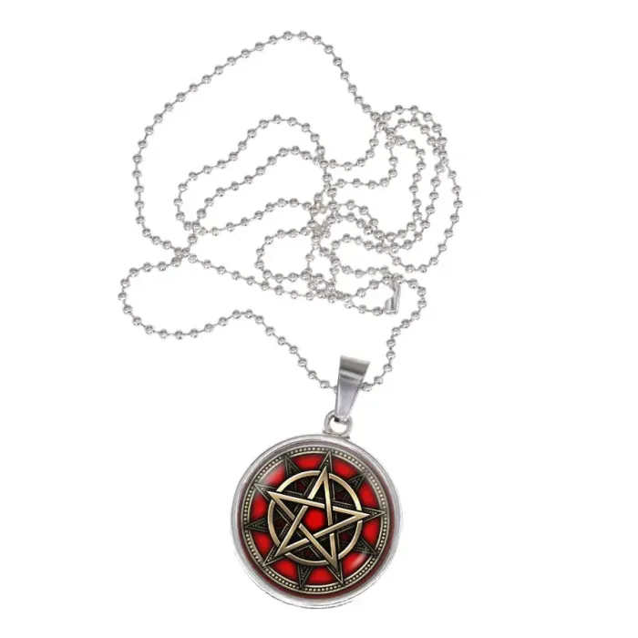 Кулон-амулет из бижутерного сплава с покрытием под серебро и изображением пентаграммы под стеклянной линзой.