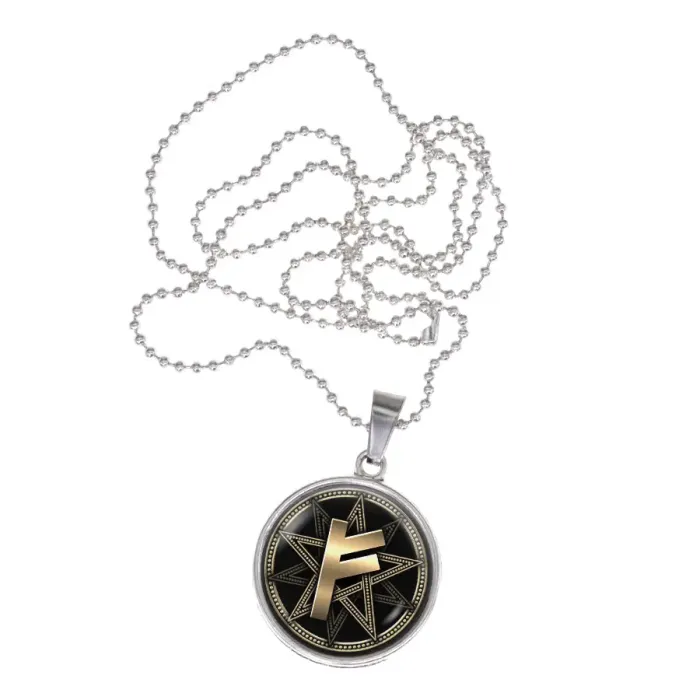 Сувенирный амулет-кулон Феху из бижутерного сплава с выпуклой стеклянной линзой.