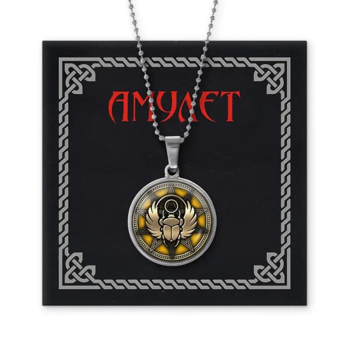Сувенирный кулон-амулет «Крылатый скарабей» из бижутерного сплава с изображением под стеклянной линзой.