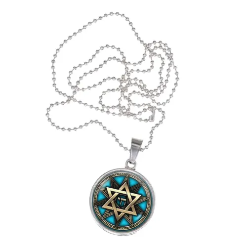 Амулет Звезда Давида — кулон из бижутерного сплава с покрытием под серебро. Символ расположен под выпуклой стеклянной линзой.