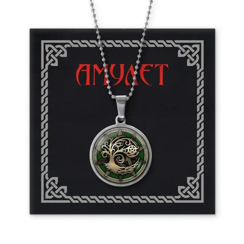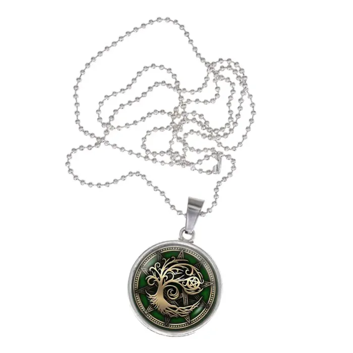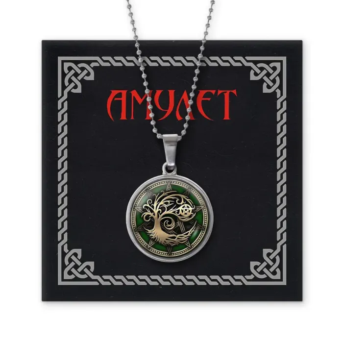 Амулет-кулон из бижутерного сплава с изображением дерева жизни и пентаграммы под выпуклой стеклянной линзой.