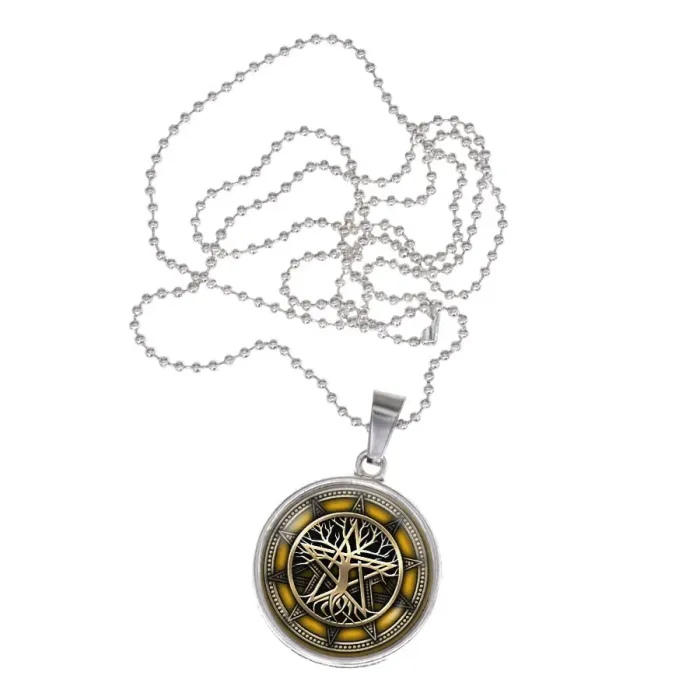 Амулет-кулон из бижутерного сплава с изображением Дерева жизни под защитной стеклянной линзой.