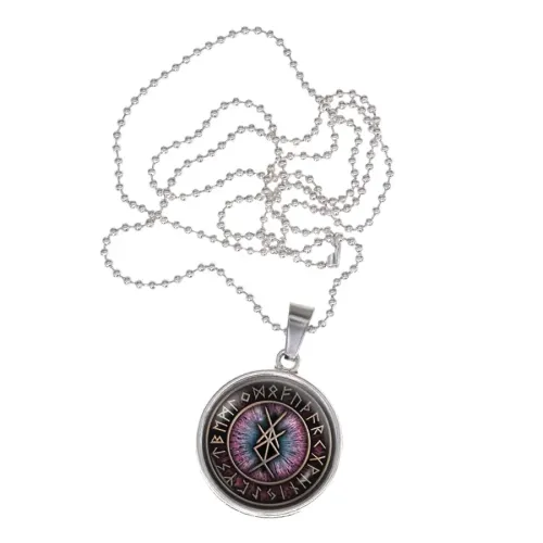 Сувенирный амулет для ношения. Изготовлен из бижутерного сплава с покрытием под серебро. Изображение с рунами находится под выпуклой стеклянной линзой.