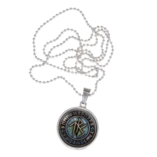 Сувенирный кулон-амулет из бижутерного сплава с покрытием под серебро и выпуклой стеклянной линзой.