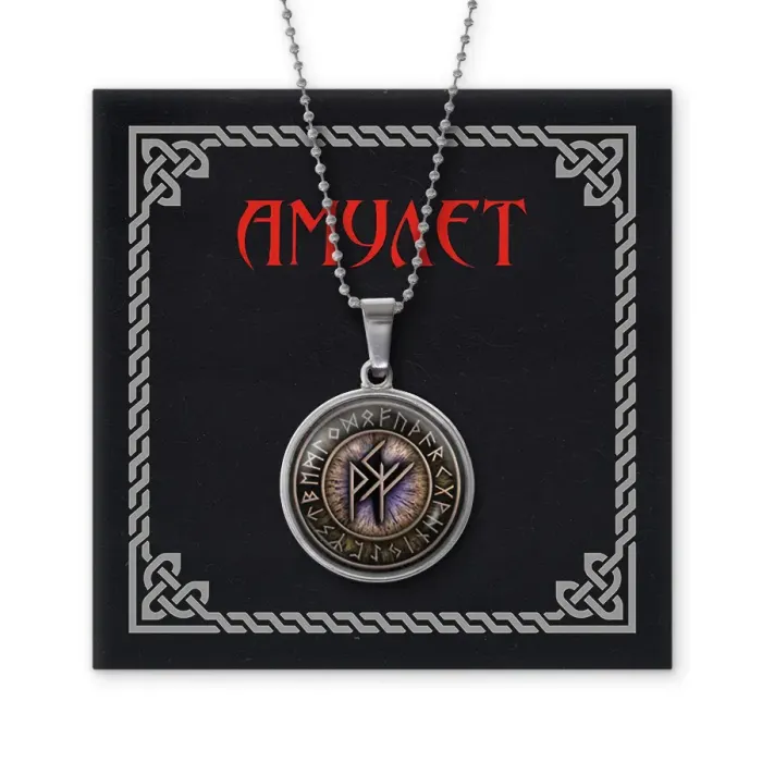 Сувенирный кулон-амулет из бижутерного сплава с покрытием под серебро и выпуклой стеклянной линзой.
