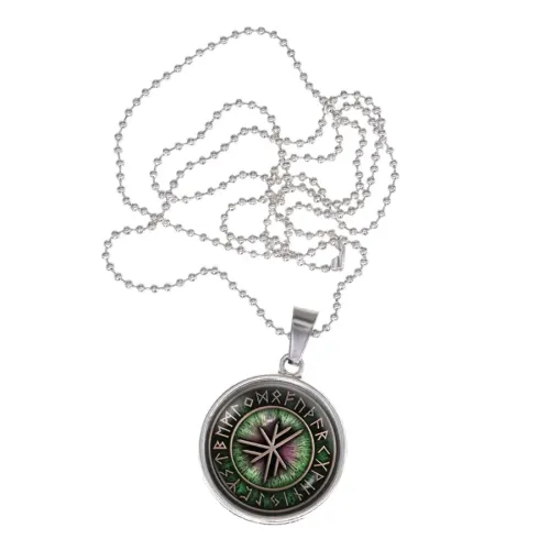 Сувенирный кулон из бижутерного сплава с изображением рун, защищённым стеклянной линзой.