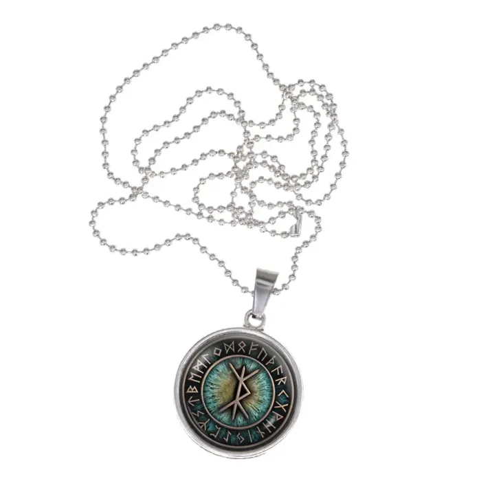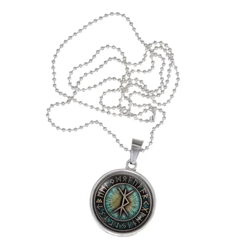 Сувенирный кулон-амулет для путешественников из бижутерного сплава с выпуклым стеклянным элементом.