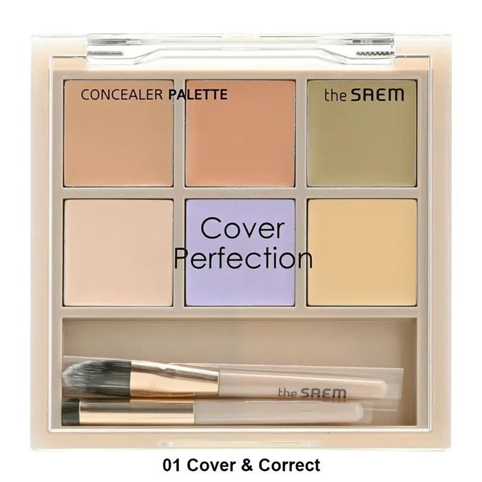 Палетка консилеров Cover Perfection Concealer Palette 01 Cover&Correct от THE SAEM INTERNATIONAL CO. LTD., Южная Корея, представляет собой универсальное средство для коррекции несовершенств кожи лица. В комплект входят пять оттенков консилера, хайлайтер и кисть для удобного нанесения. Кремовая текстура консилеров обеспечивает мягкое и равномерное покрытие, позволяя скрыть тёмные круги под глазами, замаскировать пигментные пятна и веснушки, а также сделать покраснения на коже менее заметными. Хайлайтер в наборе добавляет трёхмерное сияние, придавая коже здоровый вид.