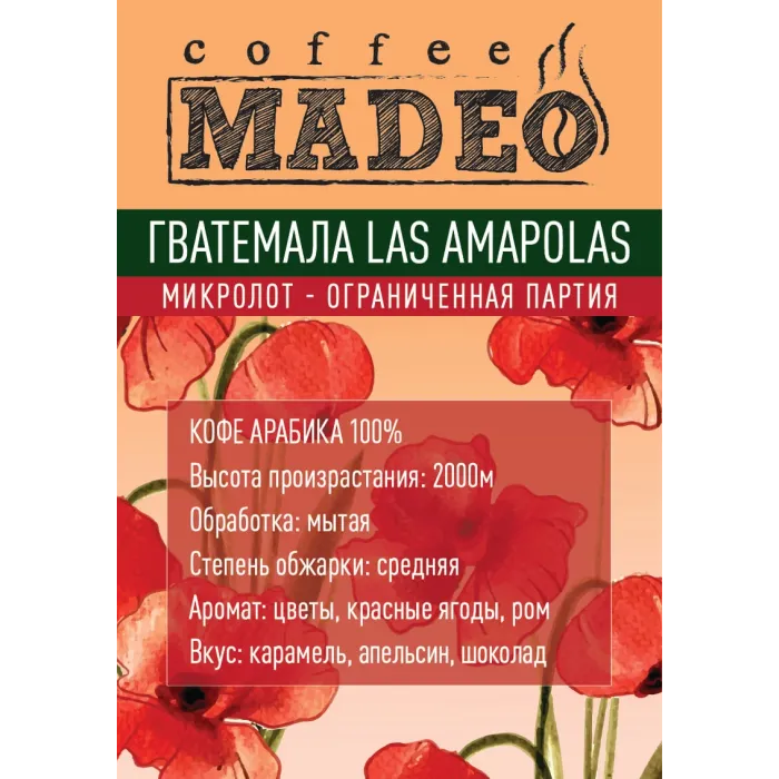 Плантационный молотый кофе Madeo из Гватемалы, микролот с плантации Las Amapolas в регионе Уэуэтенанго. Выращен на высоте до 2000 метров, обладает насыщенным фруктовым профилем с нотами карамели, красного апельсина и шоколада, дополненными цветочным ароматом и лёгким оттенком рома.
