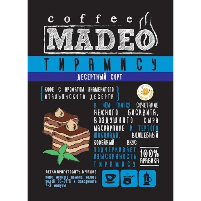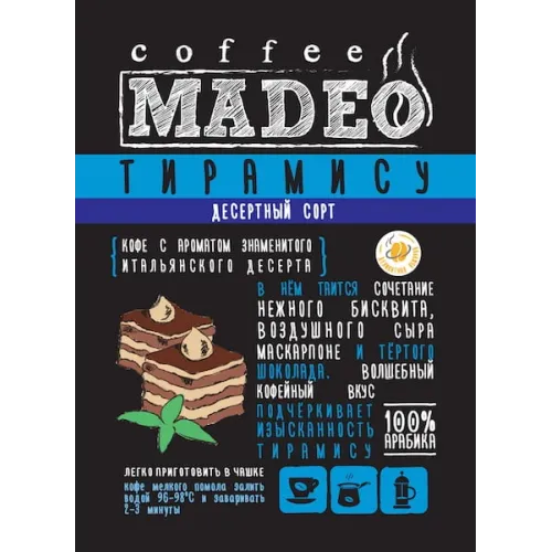 Десертный кофе Madeo на основе крупных зёрен марагоджип из Никарагуа. Вкусовой профиль вдохновлён знаменитым итальянским десертом, раскрывая ноты нежного бисквита, кремового маскарпоне и тёмного шоколада. Средняя обжарка обеспечивает сбалансированную кислотность, плотное тело и насыщенный вкус.