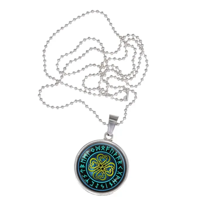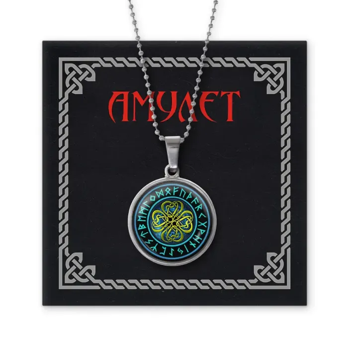 Кулон-амулет из бижутерного сплава с покрытием под серебро и изображением четырёхлистного клевера под выпуклой стеклянной линзой.