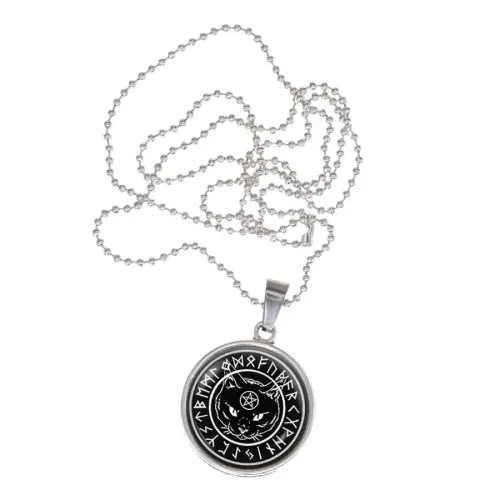 Сувенирный амулет в виде кулона с изображением черного кота, выполненный из бижутерного сплава. Изображение защищено выпуклой стеклянной линзой.