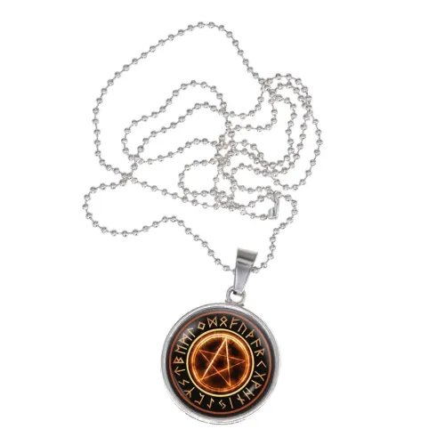 Амулет-кулон в виде пентаграммы, выполненный из бижутерного сплава. Символ расположен под выпуклой стеклянной линзой.