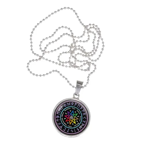 Амулет Викканское колесо года — это компактный кулон, выполненный из бижутерного сплава с покрытием под серебро. Изображение амулета защищено выпуклой стеклянной линзой диаметром 20 мм, что придаёт ему особую выразительность. Размер кулона составляет 26x22 мм, а в комплект входит металлическая цепочка длиной 49 см с застёжкой и фирменный чёрный вкладыш. Упаковка представлена в прозрачном полипропиленовом пакетике без подвеса, на котором размещена этикетка с описанием амулета. Этот талисман традиционно используется для защиты и покровительства сил природы, наполняя энергией стихий и являясь инструментом живой природной магии.