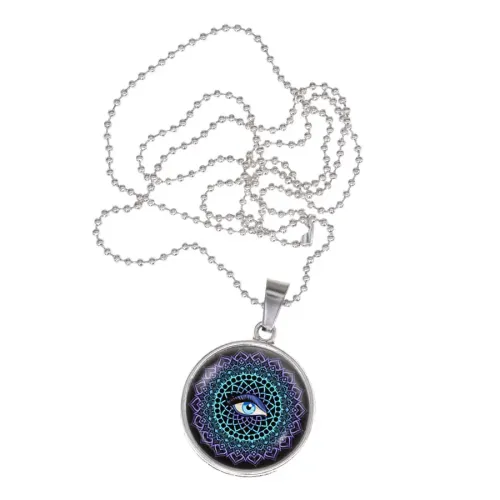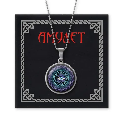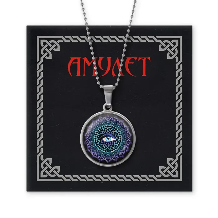 Амулет-кулон для защиты от сглаза, выполненный из бижутерного сплава. Изображение мандалы расположено под выпуклой стеклянной линзой.
