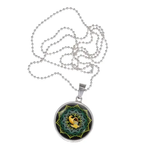 Сувенирный кулон-амулет из бижутерного сплава с изображением мандалы под стеклянной линзой.
