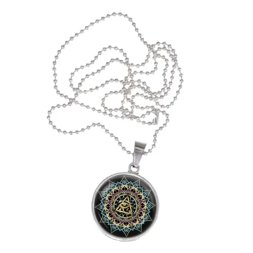 Сувенирный кулон-амулет из бижутерного сплава с изображением мандалы под выпуклой стеклянной линзой.