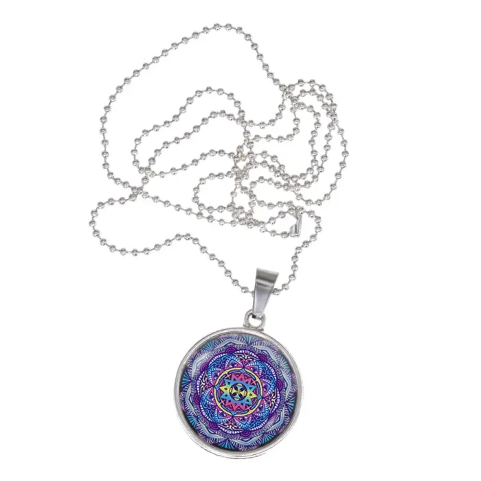 Сувенирный кулон-амулет из бижутерного сплава с покрытием под серебро. Изображение мандалы расположено под выпуклой стеклянной линзой.