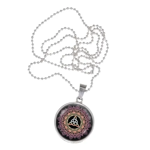 Сувенирный кулон из бижутерного сплава с покрытием под серебро. Изображение мандалы расположено под выпуклой стеклянной линзой.