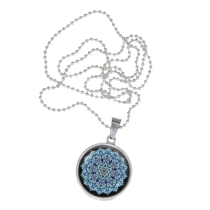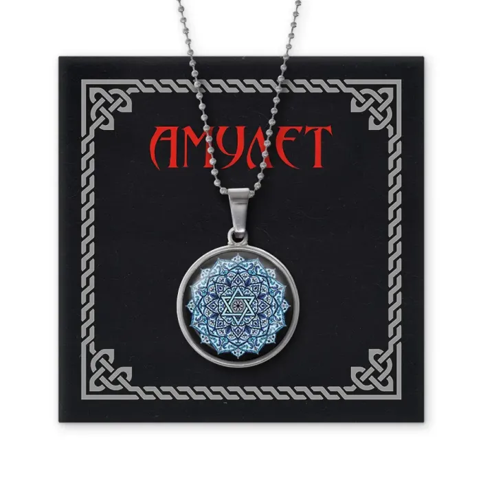 Кулон-амулет из бижутерного сплава с покрытием под серебро. Изображение расположено под выпуклой стеклянной линзой.