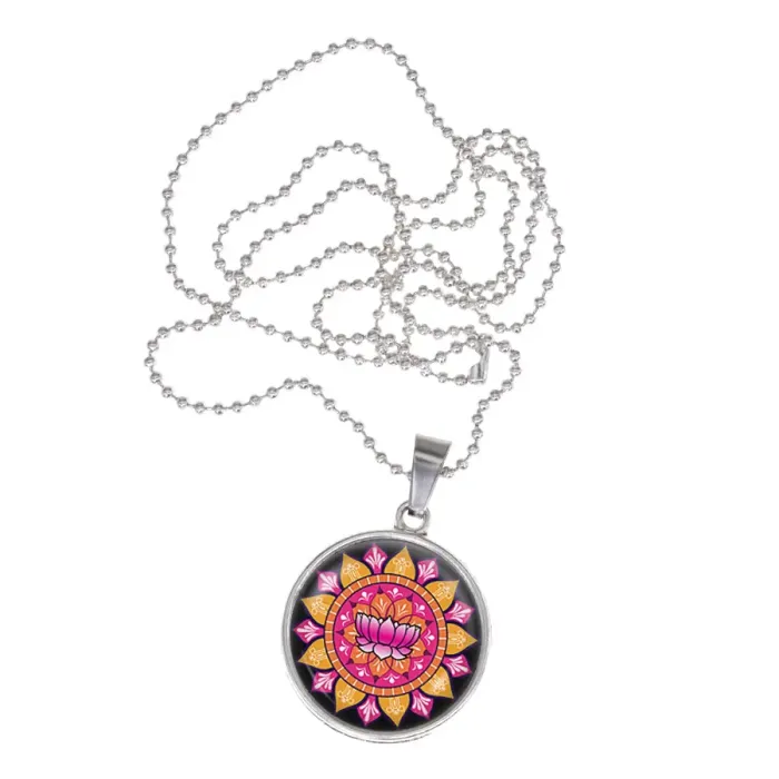 Кулон-амулет из бижутерного сплава с покрытием под серебро. Изображение мандалы расположено под выпуклой стеклянной линзой.