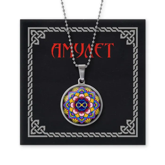 Сувенирный кулон-амулет из бижутерного сплава с покрытием под серебро. Изображение мандалы расположено под выпуклой стеклянной линзой.
