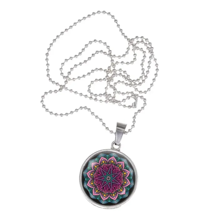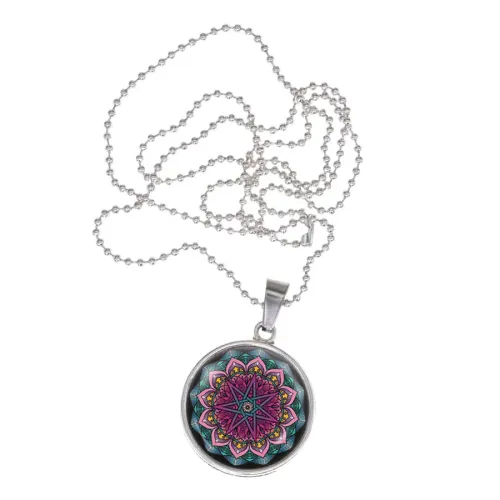 Кулон-амулет из бижутерного сплава с изображением мандалы под выпуклой стеклянной линзой.