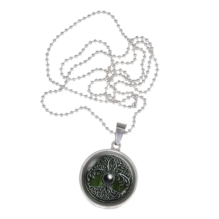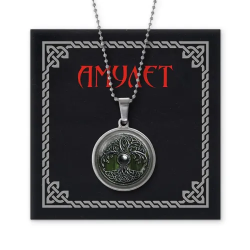 Защитный амулет в виде кулона из бижутерного сплава с покрытием под серебро. Изображение расположено под выпуклой стеклянной линзой.