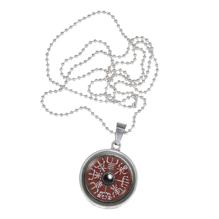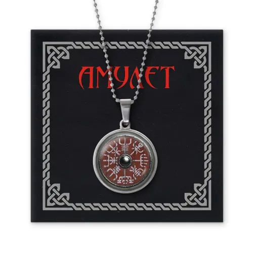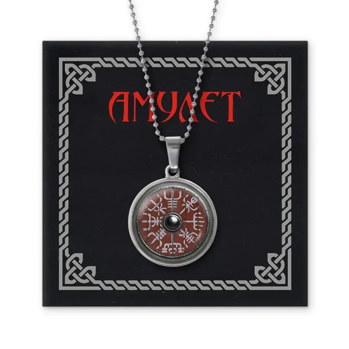Сувенирный кулон-амулет из бижутерного сплава с изображением щита и компаса Вегвизир под стеклянной линзой.