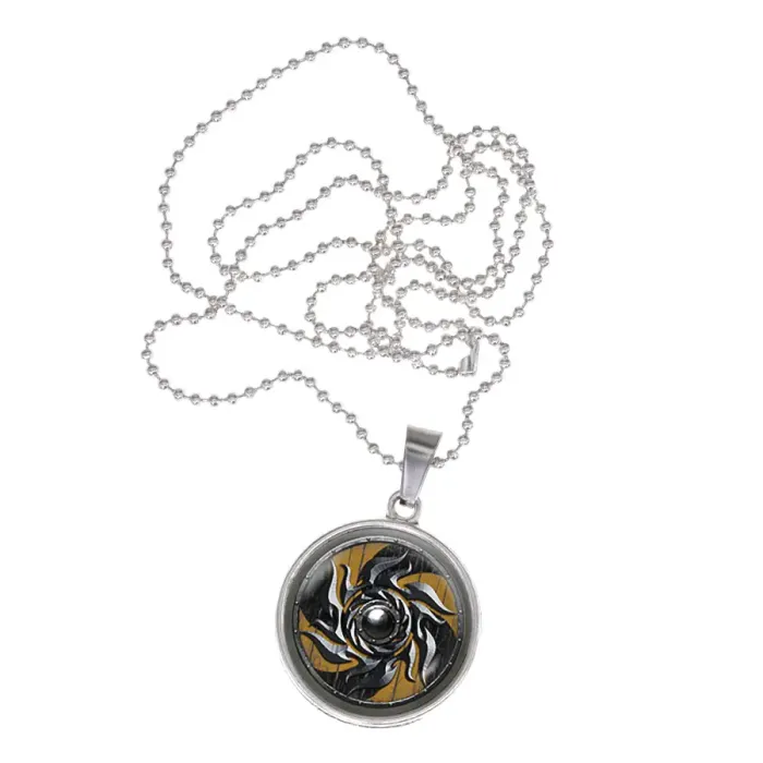 Амулет-кулон для ношения, выполненный из бижутерного сплава с покрытием под серебро. Изображение расположено под выпуклой стеклянной линзой.