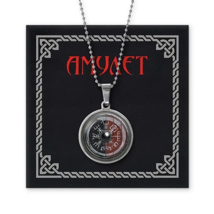 Сувенирный кулон-амулет из бижутерного сплава с изображением под выпуклой стеклянной линзой.