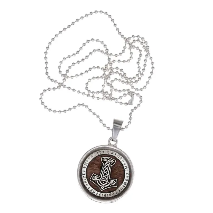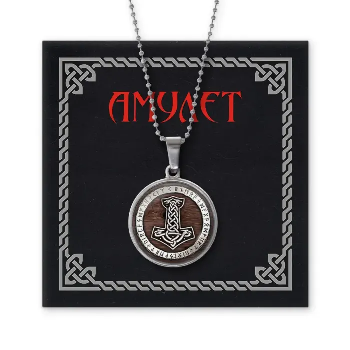 Амулет Молот Тора — кулон из бижутерного сплава с покрытием под серебро. Изображение расположено под выпуклой стеклянной линзой.
