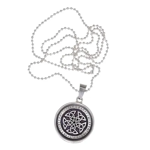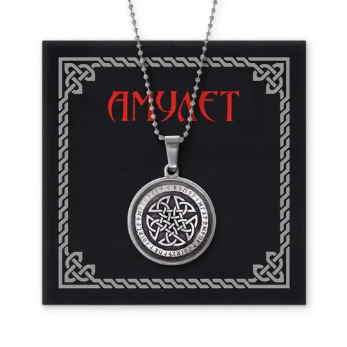 Кулон-амулет с изображением кельтской пентаграммы. Изготовлен из бижутерного сплава с покрытием под серебро, изображение расположено под выпуклой стеклянной линзой.