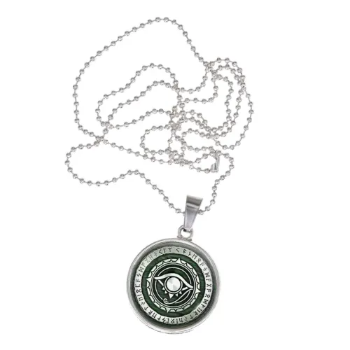 Амулет Око Провидения — кулон из бижутерного сплава с покрытием под серебро и выпуклой стеклянной линзой.