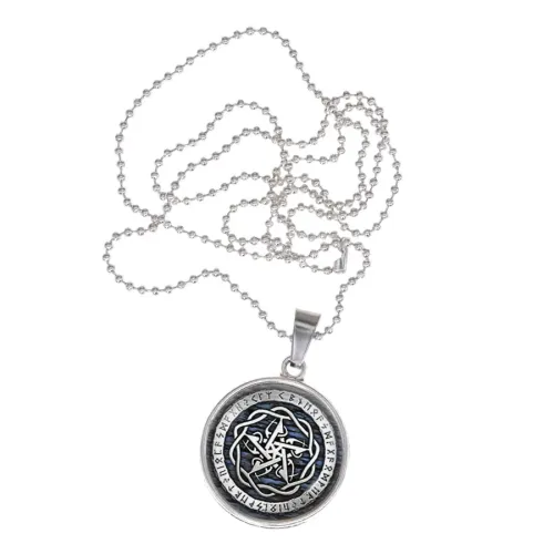 Сувенирный амулет-кулон Коловрат из бижутерного сплава с выпуклой стеклянной линзой.
