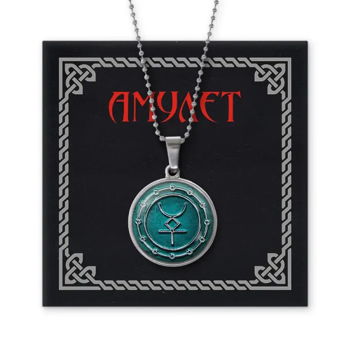 Амулет-кулон с изображением руны, выполненный из бижутерного сплава с покрытием под серебро. Изображение защищено выпуклой стеклянной линзой.