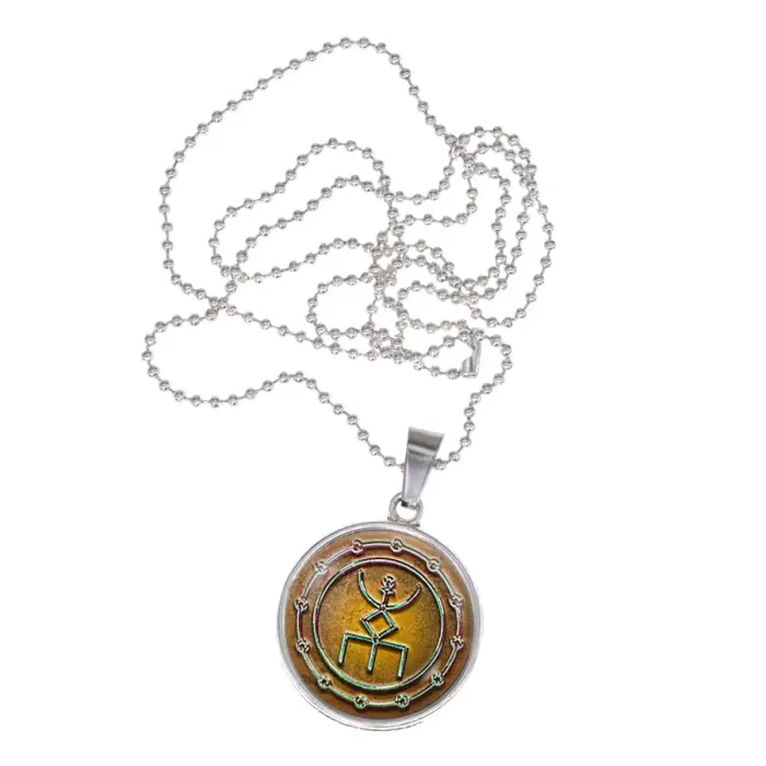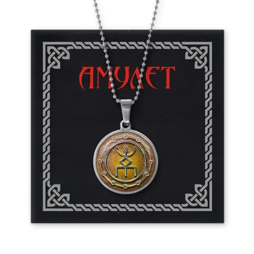 Кулон-амулет из бижутерного сплава с покрытием под серебро. Изображение руны расположено под выпуклой стеклянной линзой.