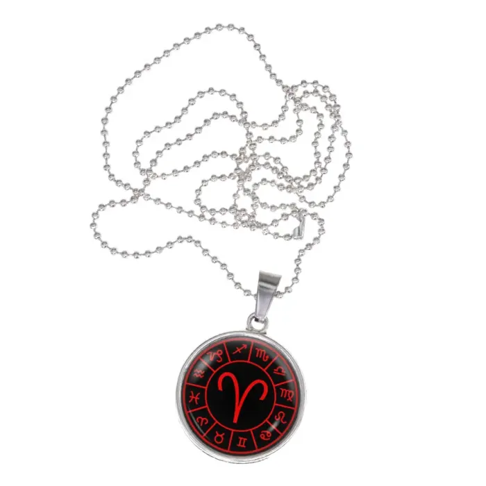 Сувенирный кулон-амулет для знака Зодиака Овен, выполненный из бижутерного сплава с серебристым покрытием. Знак расположен под выпуклой стеклянной линзой.