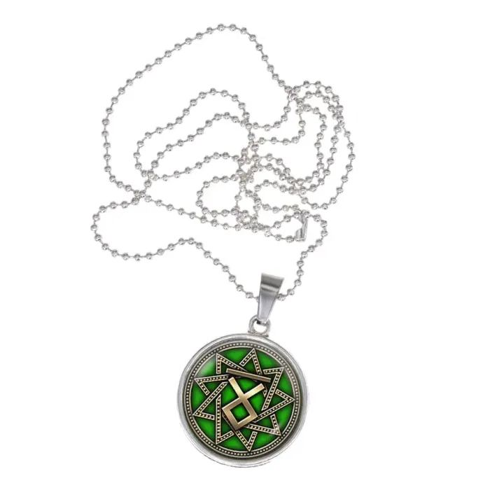 Амулет Чертог Волка — кулон из бижутерного сплава с покрытием под серебро. Изображение размещено под выпуклой стеклянной линзой.