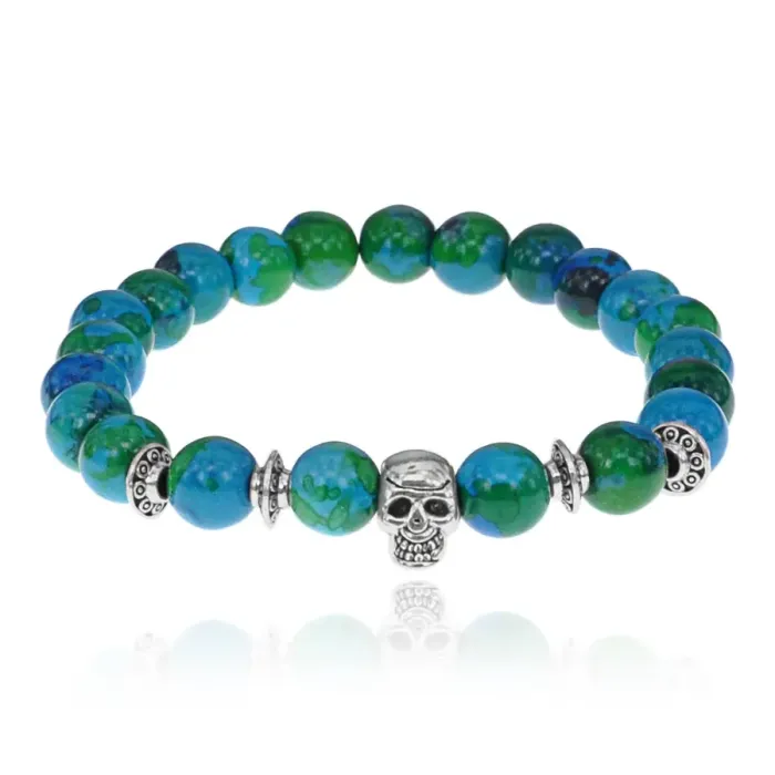 Стрейч-браслет с подвеской в виде черепа и бусинами из синтетического камня хризоколла.