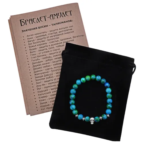 Браслет-амулет Череп с синт. камнем Хризоколла 8мм BSH-02-21S