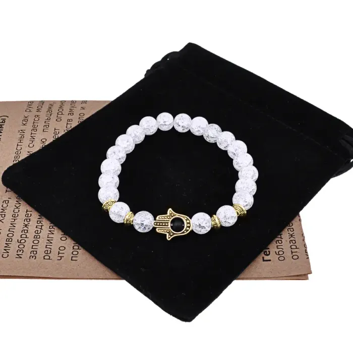 Браслет-амулет Хамса с подвеской в виде ладони и бусинами из синтетического сахарного кварца.