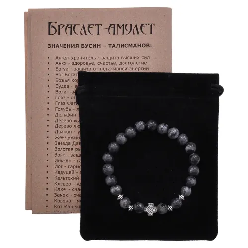Стрейч-браслет с подвеской в виде четырёхлистного клевера и бусинами из натурального лабрадора.