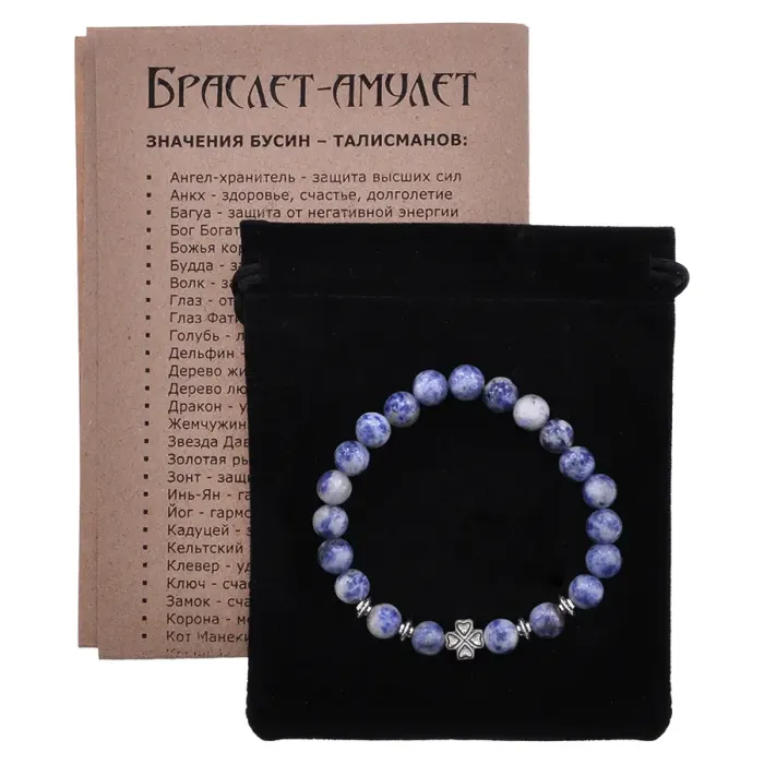 Четырёхлистный клевер является мощным талисманом, который традиционно привлекает благополучие и успех в жизни владельца. Этот символ способствует исполнению желаний и защищает от негативных воздействий, помогая сохранять оптимизм и уверенность в своих силах. Содалит ценится за свою способность дарить волю, мужество и гармонию, а также поддерживать бизнес начинания и интеллектуальные стремления.