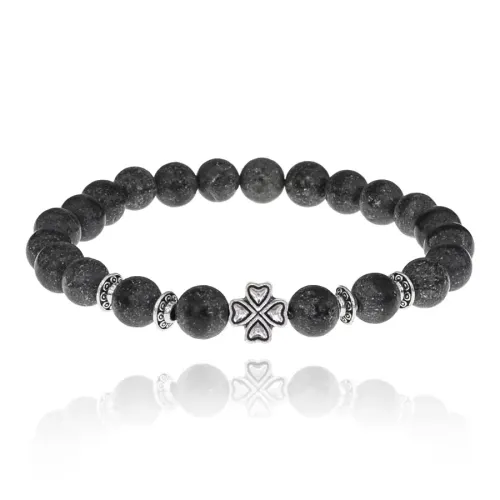 Стрейч-браслет с бусинами из натурального камня змеевик и подвеской в виде четырёхлистного клевера.