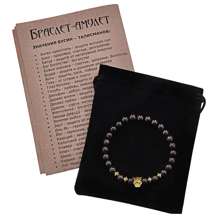 Стрейч-браслет с амулетом в виде леопарда и бусинами из натурального граната.