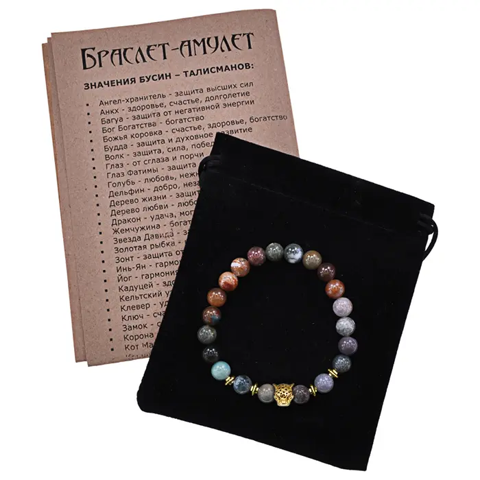 3. Упаковка: браслет поставляется в прозрачном пакете с еврослотом, а также включает бархатный мешочек и буклет с описанием значений камней.